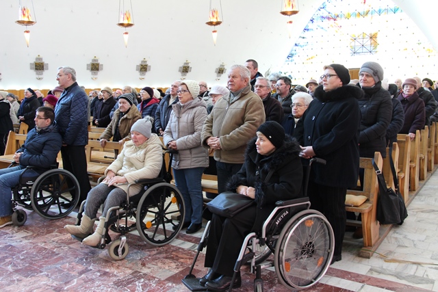 W homilii biskup kaliski wskazał, że papież Leon XIII w 1891 r. ustanowił lokalne święto Objawienia Matki Bożej z Lourdes, a św. Pius X w 1907 r. rozciągnął je na cały Kościół. Dodał, że św. Jan Paweł II w 1992 r. wybrał dzień 11 lutego na Światowy Dzień Chorego. Biskup przypomniał historię objawień Matki Bożej św. Bernadetcie Soubirous w Lourdes i wskazał na przypadki uzdrowień w tym miejscu. Zaznaczył, że Światowy Dzień Chorego zwraca uwagę na obecność w świecie cierpienia fizycznego i duchowego. – Choroby i cierpienie istnieją w świecie od czasów rajskich. Historia każdego narodu i każdego człowieka zawiera karty zapisane cierpieniem. Cała Biblia jest wypełniona tekstami dotyczącymi cierpienia – powiedział celebrans. Dodał, że przykładem cierpienia niezawinionego jest Hiob. – Na przykładzie Hioba okazało się, że nie jest prawdą, iż każde cierpienie jest następstwem winy i ma charakter kary za grzeszne życie. Jednakże bywało i tak jak w przypadku Hioba, że cierpienie miało charakter próby. Warto o tym pamiętać, że cierpienie ma niekiedy charakter próby i Bóg zsyła je na człowieka, by go wewnętrznie pogłębić i oczyścić – tłumaczył kaznodzieja. Podkreślał, że Chrystus poprzez swoją mękę i śmierć na krzyżu nadał sens każdemu ludzkiemu cierpieniu, a prawdę tę przypomniał św. Jan Paweł II w liście apostolskim „Salvifici doloris” ogłoszonym 11 lutego 1984 r. Ubolewał, że dla mediów cierpienie jest nieatrakcyjne i mało miejsca poświęca się mu. – Żyjemy w świecie wypełnionym cierpieniem. Niewiele mówi się o tym w mediach, gdyż tam promuje się młodość, ukazuje się ludzi zdrowych, wysportowanych, silnych i atrakcyjnych. Samo ukazywanie takich ludzi nie jest czymś złym, ale uczciwość jednak wymaga, aby nie zatajać trudnej i głębokiej prawdy o cierpieniu, by nie usuwać na margines ludzi chorych i cierpiących, których tak wielu jest wśród nas – mówił hierarcha. Przekonywał, że chorzy są szczególnie ważną cząstką Kościoła. – Ojciec Święty Jan Paweł II często nazywał chorych skarbem Kościoła. Nie złoty kielich, piękne szaty ani wspaniałe budowle, ale Wy jesteście skarbem Kościoła. Papież Benedykt XVI powiedział, że bez Chrystusa nie potrafimy godnie przeżywać naszego cierpienia, naszej choroby, naszych dolegliwości – podkreślał ordynariusz diecezji kaliskiej. Wskazał, że sakrament chorych, w którym Chrystus niesie umocnienie jest wielkim darem dla ludzi starszych i chorych. – Przyjmujcie z wiarą dar namaszczenia. Przyjmijmy z wiarą Ciało Chrystusa. Prośmy Maryję, którą nazwano Uzdrowieniem Chorych o opiekę nad nami. Prośmy z wiarą, a zostaniemy wysłuchani – powiedział bp Janiak.