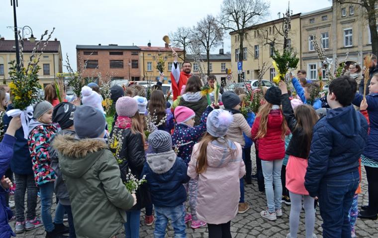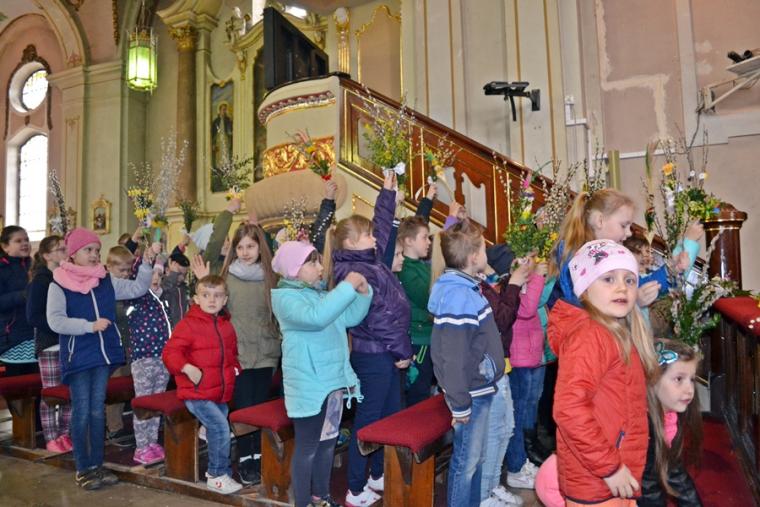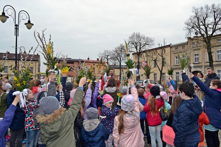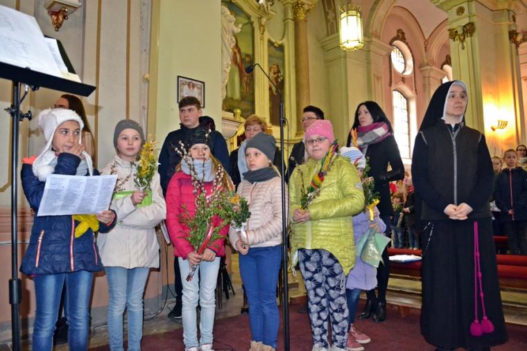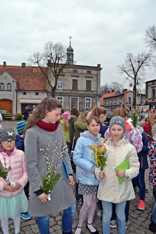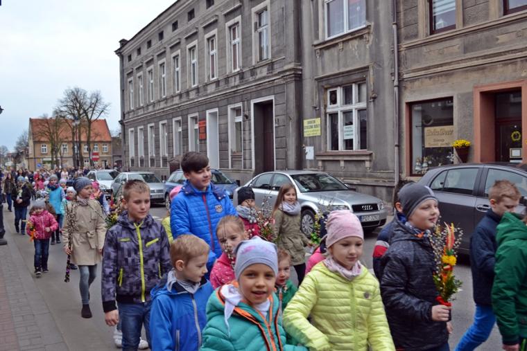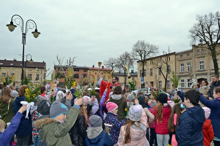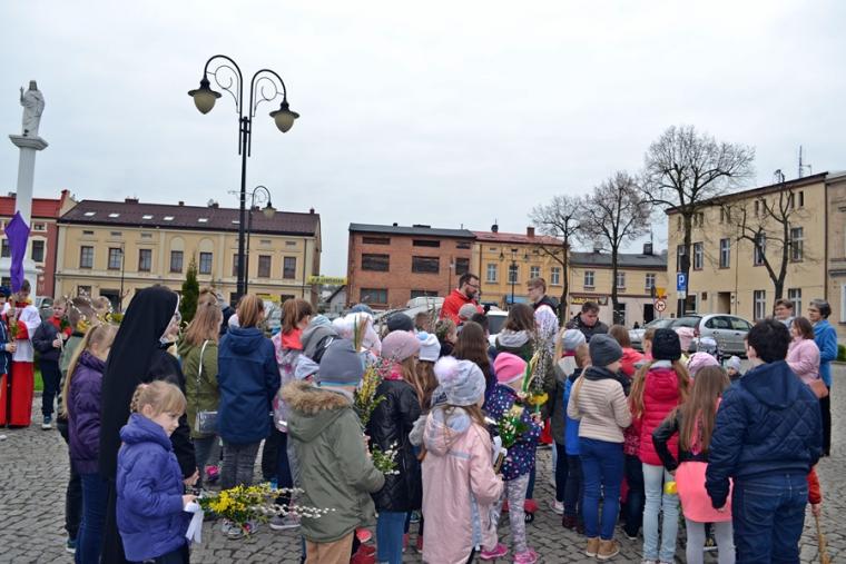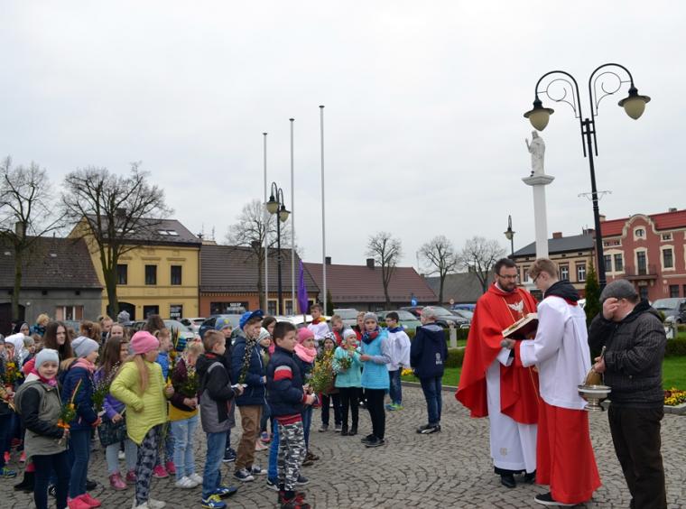 Około godz. 11:00 na mikstacki Rynek zaczęły przychodzić dzieci z palmami  w rękach, ale nie brakowało także osób dorosłych. O godz. 11:00 w mikstackim wieczerniku w niedziele sprawowana jest Msza Święta ze szczególnym udziałem dzieci i młodzieży. O godzinie jedenastej w asyście ministrantów niosących krzyż na Rynek przybył ks. wikariusz Krzysztof Lipiński, który po odmówieniu specjalnej modlitwy pobłogosławił palmowe gałązki. Następnie procesjonalnie za krzyżem zgromadzeni na Rynku młodsi i starsi parafianie ze śpiewem na ustach, z palmami  w rękach udali się na Mszę Świętą do kościoła farnego. Tu ks. Krzysztof pobłogosławił palmy zgromadzonych w kościele, następnie rozpoczęła się Msza Święta podczas której odczytany został  opis Męki Pańskiej. Podczas Mszy Świętej śpiewał parafialny zespół młodzieżowy.