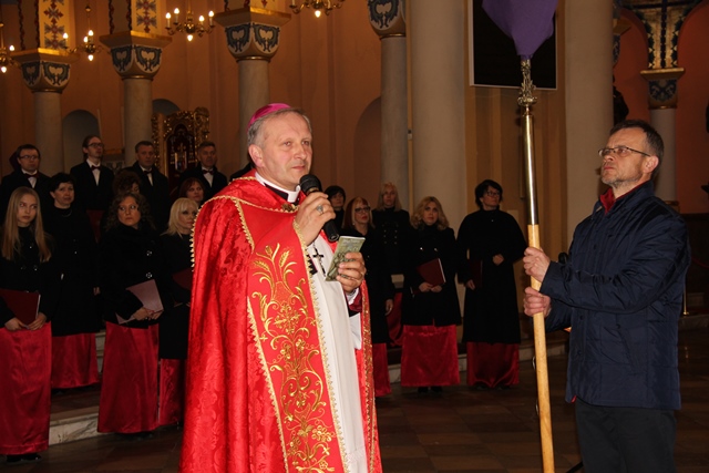 Na zakończenie drogi krzyżowej pasterskiego błogosławieństwa udzielił bp Łukasz Buzun. – Droga krzyżowa jest rekonstrukcją człowieka. To wszystko co przeżywamy w drodze krzyżowej, czego doświadczamy, co kontemplujemy jest nieodzowne, żeby człowiek z tych różnych doświadczeń, myśli i spraw, które niesie w swoim sercu i które wydarzyły się na drodze jego życia odnajdywał to co jest najważniejsze, czyli tą Bożą nić miłości i wtedy to wszystko co jest porozrywane, pełne niepokoju, co napełnia człowieka lękiem i bólem tworzy harmonijną mozaikę. Ta wędrówka drogą krzyżową niech owocuje odnalezieniem Bożej nici miłości, która tworzy wielką jedność chociaż w różnorodności – mówił diecezjalny duszpasterz środowisk twórczych.