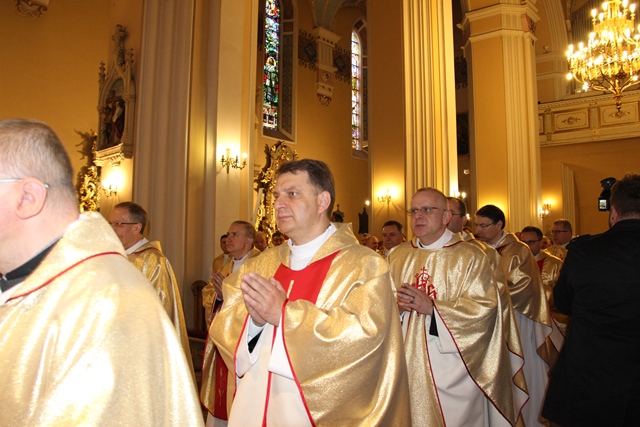 Na początku Eucharystii ks. prał. Adam Modliński powitał biskupów i kapłanów. Przypomniał, że w tym roku diecezja kaliska świętuje jubileusz 25-lecia powstania. – Wczoraj, 12 kwietnia, minęło 25 lat od uroczystego ingresu pierwszego biskupa kaliskiego do katedry – powiedział proboszcz katedry. Dodał, że od 1992 r. dla diecezji kaliskiej wyświęcono 305 kapłanów. Wspomniał też zmarłych księży. Zaznaczył, że w ciągu 25 lat istnienia diecezji kaliskiej odeszło do Pana 169 kapłanów. Pozdrowił również jubilatów obchodzących 60., 50. i 25. rocznicę święceń kapłańskich. Zaznaczył, że księża zgromadzeni w kaliskiej katedrze łączą się duchowo z kapłanami przebywającymi poza granicami kraju.