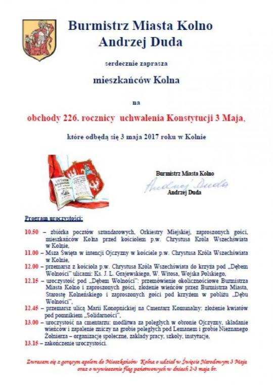 3 maja odbędą się uroczystości związane z kolejną rocznicą uchwlenia Konstytucji w całym kraju. Do aktywnego uczestnictwa w nich zachęca mieszkańców również Burmistrz Miasta Kolno-p.Andrzej Duda.