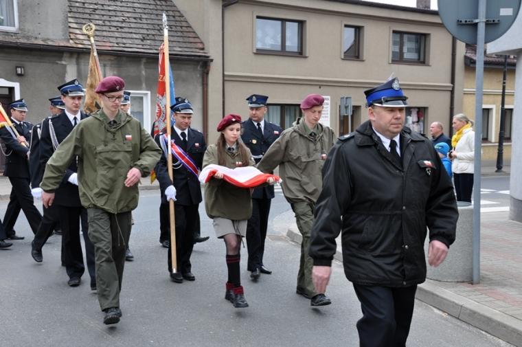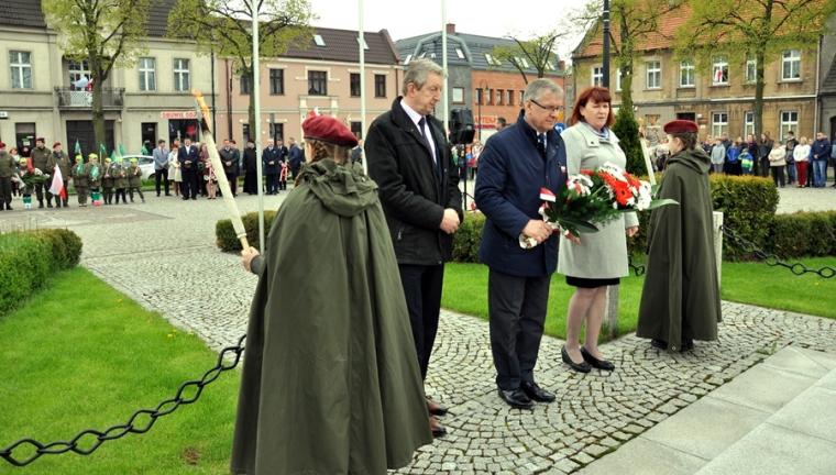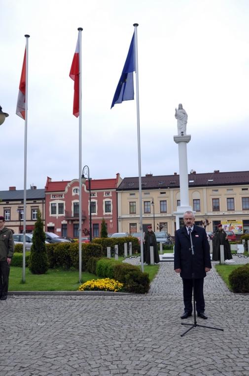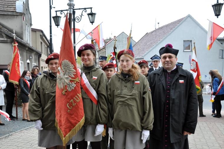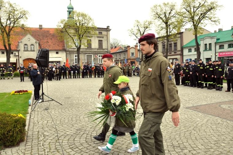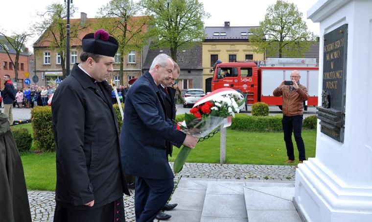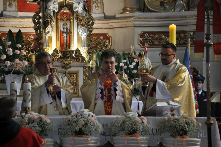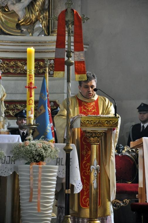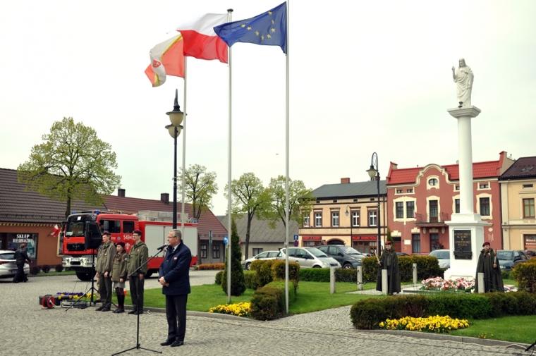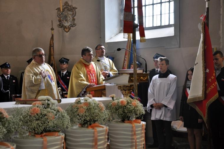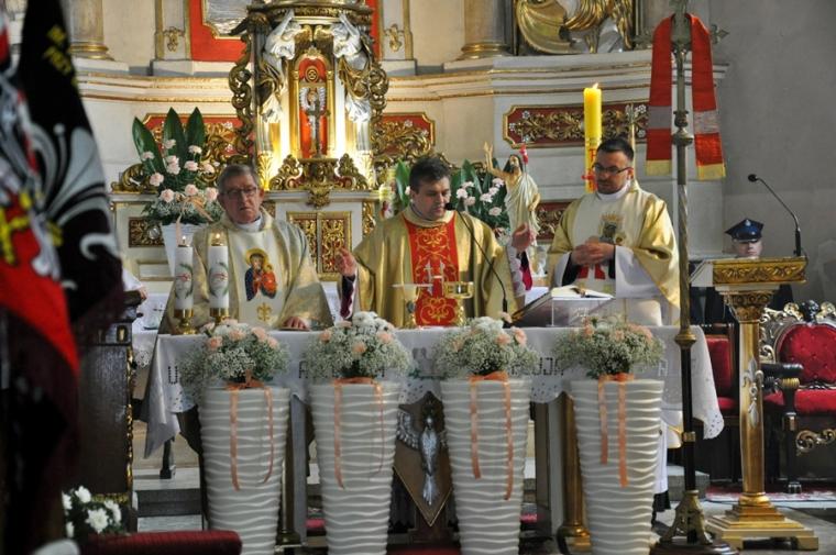 Przy ołtarzu stanęło trzech kapłanów. Ks. kan. Krzysztof Ordziniak modlił się o pomyślność dla naszej Ojczyzny Polski, ale także dla naszej małej Ojczyzny, której jak podkreślił od dziesięciu lat patronuje św. Roch. Ks. kan. Grzegorz Klapa polecał prosił o radość wieczną dla wszystkich poległych w obronie Ojczyzny, ks. wikariusz Krzysztof Lipiński modlił się  za zmarłych polecanych w wymieniankach. Jak podkreślił główny celebrans, to często właśnie tym osobom, naszym rodzicom, dziadkom zawdzięczamy przekaz pięknych tradycji, które wyróżniają naszą społeczność. Homili podczas tej Mszy św. wygłosił ks. kan. Krzysztof Ordziniak. Rozpoczynając rozważanie przywołał  słowa Adama Mickiewicza z „Pana Tadeusza” skierowane do Matki Bożej wskazał, że  w nich zawiera się  nasza Ojczyzna – Polska. Kontynuując podkreślił, że Polacy zawsze szanowali tych, którzy czcili Matkę Bożą Królową Polski. Przywołał opis konania Janusza Radziwiłła. Kaznodzieja podkreślił, że także współcześnie uciekamy się pod opiekę Maryi Królowej Polski. Wskazał, że szczególnym zagrożeniem dla religii i pokoju w Ojczyźnie jest grzech. Zwrócił uwagę, że dla rozwoju Ojczyzny konieczne jest nasze nawrócenie, które możliwe jest tylko wtedy gdy odkryjemy grzech, przyznamy się do niego, a następnie podejmiemy z nim walkę. Ks. kan. Krzysztof zachęcał zebranych o ożywienie nabożeństw do Matki Bożej.Podkreślił, że z przeżywaną uroczystością związane są trzy kwestie:„1)Maryja od wieków jest Królową Polski, co oznacza, że na tej ziemi ma panować prawo jej Syna, prawo Boże; 2) Konstytucja 3 Maja, pierwsza nowoczesna ustawa zasadnicza Europy, oparta na prawie Bożym, powstała tu, w Polsce; 3) Najgłębszy związek wiary  i patriotyzmu, związek narodu- suwerena i Kościoła przejawia się właśnie w święcie 3 Maja”. W dalszej części homilii kaznodzieja nawiązał do dokumentu Episkopatu Polski przygotowany przez Radę ds. Społecznych „ Chrześcijański kształt patriotyzmu”. Nawiązując do punktu 5 wymienionego dokumentu ks. kan. nawiązał do znaczenia patriotyzmu lokalnego. Podkreślając  rolę wielu pokoleń naszych przodków, którzy troszczyli się o przekaz tradycji odpustowych wskazał, że w tym także wyraża się patriotyzm. Zwrócił uwagę na jubileusz 10- lecia ustanowienia patronatu św. Rocha nad miastem, który będziemy przeżywali  w tym roku. Podkreślił, że miasto ma swoją flagę  i na dzień patrona miasta nasze domostwa są nią dekorowane. Kończąc homilię kaznodzieja skierował  słowa zachęty do wszystkich, którzy troszczą się o losy Polski, aby „ nie ustawali w kształtowaniu szlachetnego, opartego o chrześcijańską miłość bliźniego polskiego patriotyzmu”. Po końcowym błogosławieństwie została odśpiewana pieśń „Boże coś Polskę…”. Następnie uczestnicy uroczystości udali się na Rynek pod pomnik Najświętszego Serca Jezusowego.    Po wciągnięciu flagi na maszt przez przedstawicieli harcerzy i odśpiewaniu hymnu przez zebranych okolicznościowe przemówienie wygłosił Pan Burmistrz Henryk Zieliński.  Przypomniał w nim  udział Mikstaczan w upowszechnianiu Konstytucji 3. Maja. W związku ze zbliżającym się świętem patronalnym strażaków skierował do nich słowa podziękowania za ich służbę oraz złożył im życzenia.  Po okolicznościowym przemówieniu nadszedł czas na składanie kwiatów pod pomnikiem przez przedstawicieli władz, mieszkańców poszczególnych miejscowości, druhów strażaków, przedstawicieli organizacji. Podczas uroczystości pod figura Najświętszego Serca Jezusowego młodzi strażacy złożyli ślubowanie. W związku ze zbliżającym się Dniem Strażaka wręczone zostały Druhom Strażakom medale i odznaczenia. Na zakończenie uroczystości głos zabrał p. Lech Janicki Starosta Powiatu Ostrzeszowskiego, który wyraził uznanie dla organizacji uroczystości zarówno w kościele, jak i na mikstackim Rynku. Wyprowadzenie pocztów sztandarowych zakończyło uroczystość na Rynku. Uświetniła ją Orkiestra Parafialna. Grupą, którą szczególnie warto zauważyć i podkreślić  jej  zaangażowanie w uroczystości o charakterze religijnym i patriotycznym   w naszym miasteczku  są harcerze z 1 Szczepu ZHP Ziemi Mikstackiej im. Powstańców Wielkopolskich.
