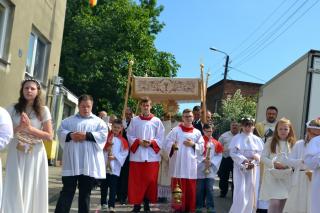 Po Mszy Świętej przed wystawionym Najświętszym Sakramentem, odmówiliśmy Litanię do Serca Jezusowego. Następnie wraz z Jezusem ukrytym pod postacią Chleba wyruszyliśmy w procesji do czterech ołtarzu. Krzyż, chorągwie, feretrony, poduszki z emblematami religijnymi niesione przez dzieci poprzedzały w procesji Jezusa ukrytego pod postacią Chleba niesionego w monstrancji. Tuż przed kapłanem niosącym monstrancje szły dziewczynki sypiące kwiatki. Pięknie przygotowane zostały ołtarze.