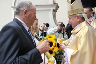 Bp Edward Janiak przewodniczył uroczystej Mszy św. dziękczynnej za tegoroczne plony w Skalmierzycach. Przed Eucharystią bp Janiak poświęcił i obejrzał wieńce dożynkowe przywiezione przez delegacje rolników z trzydziestu trzech dekanatów diecezji kaliskiej i sołectw z gminy Nowe Skalmierzyce. Biskup podziwiał trud pracy, który rolnicy włożyli w przygotowanie wieńców.
