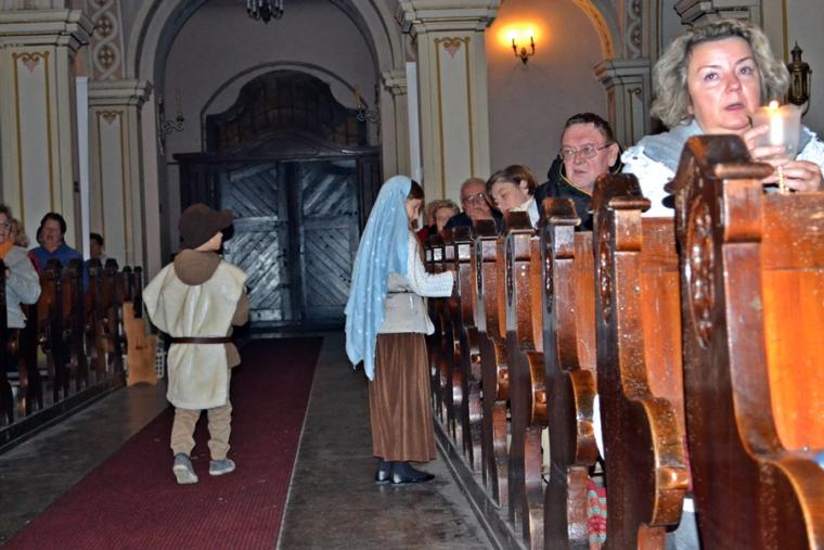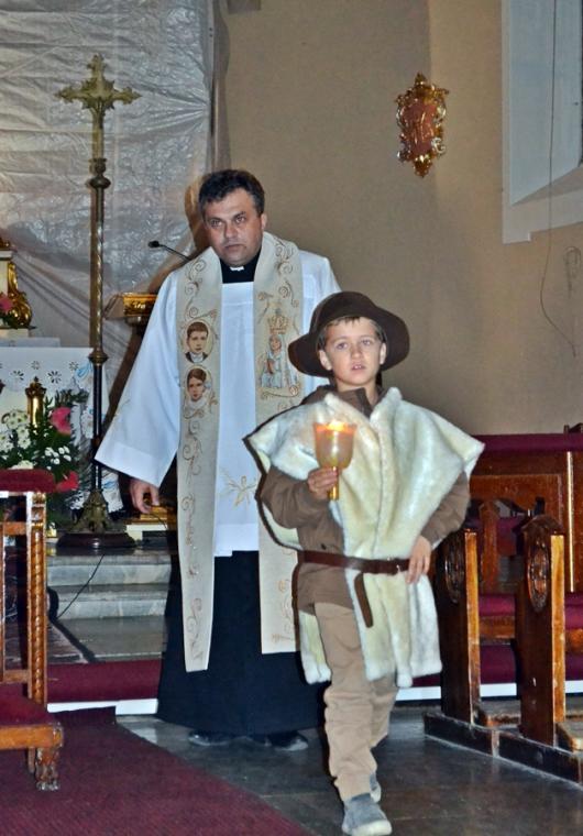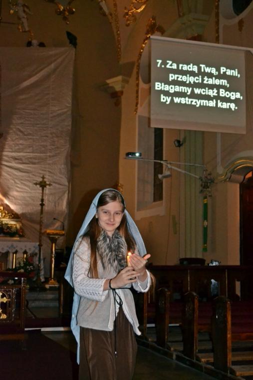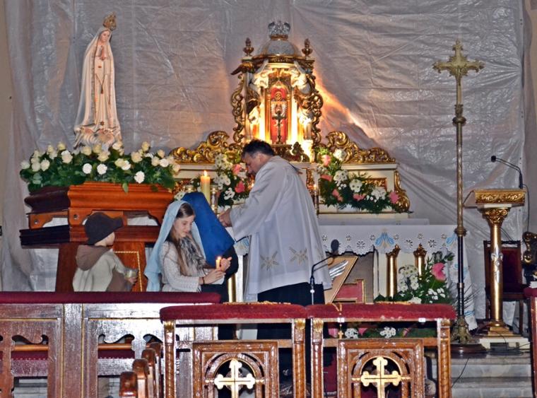W atmosferę ostatniego objawienia fatimskiego wprowadził nas film „Cud słońca”. Przy pięknie ozdobionej figurze Matki Bożej Fatimskiej ustawionej tym razem nieopodal ołtarza pojawili się także trzej pastuszkowie. W postacie te wcieliło się troje dzieci z naszej parafii, które po zakończeniu trzeciej tajemnicy różańca rozniosły zebranym w kościele światło odpalane od świecy jubileuszowej.