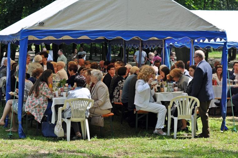 Po dziękczynieniu Panu Bogu nadszedł czas na radosne spotkanie w Parku Świętego Rocha. Dlaczego tam?  Wielkim pragnieniem księdza Jubilata było spotkanie się przy stole ze wszystkimi uczestnikami dziękczynnej Eucharystii. Żadna sala nie byłaby w stanie pomieścić wszystkich tych, którzy  w tym wyjątkowym dniu ofiarowali ks. Jubilatowi najcenniejszy dar – modlitwę.