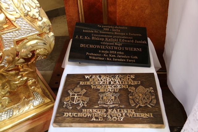 Bp Janiak poświęcił dwie tablice: jedną upamiętniającą 300-lecie kościoła i drugą wykonaną z okazji 25. rocznicy powstania diecezji kaliskiej.