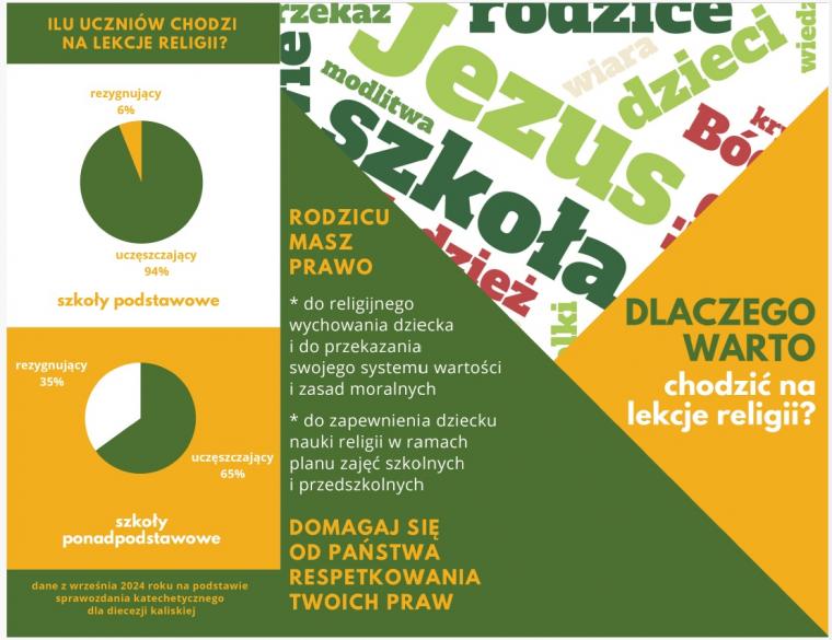 Zebraliśmy korzyści, jakie wypływają z uczęszczania na lekcje religii. Zwróciliśmy uwagę na formację religijną, jaką otrzymuje uczeń korzystający z lekcji religii oraz na wymiar humanistyczny lekcji religii tak potrzebny dla wielowymiarowego rozwoju młodego człowieka. Umieściliśmy w folderze wypowiedzi młodzieży o lekcjach religii. Nie zapomnieliśmy również o "pragmatycznym" wymiarze uczęszczania na lekcje religii, które przygotowują do przyjęcia sakramentów św. Folder zawiera także dane statystyczne dotyczące frekwencji na lekcji religii w diecezji kaliskiej. Folder trafi do rąk rodziców i uczniów w diecezji kaliskiej w trakcie kolędowej wizyty duszpasterskiej.