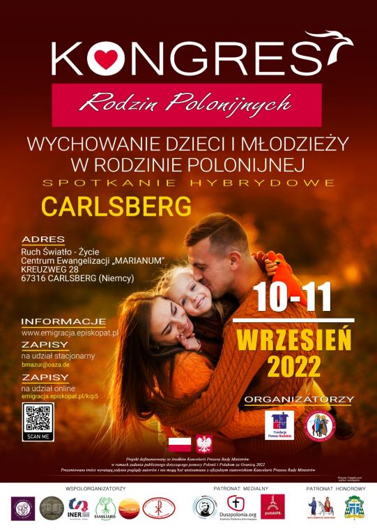 Zapraszamy na V Kongres Rodzin Polonijnych, który odbędzie się w dniach 10-11 września 2022 r. w formie hybrydowej i poświęcony będzie tematyce: "Wychowanie dzieci i młodzieży w Rodzinie Polonijnej". Kongres odbędzie się w Carlsbergu (Niemcy) w Międzynarodowym Centrum Ewangelizacji "Marianum". W Kongresie będzie można uczestniczyć także w formie online za pośrednictwem aplikacji zoom. Organizatorami V Kongresu Rodzin Polonijnych jest Polonijna Rada Rodziny przy Delegacie KEP ds. Duszpasterstwa Emigracji Polskiej oraz Fundacja „Pomoc Rodzinie”. Serdecznie zapraszamy!