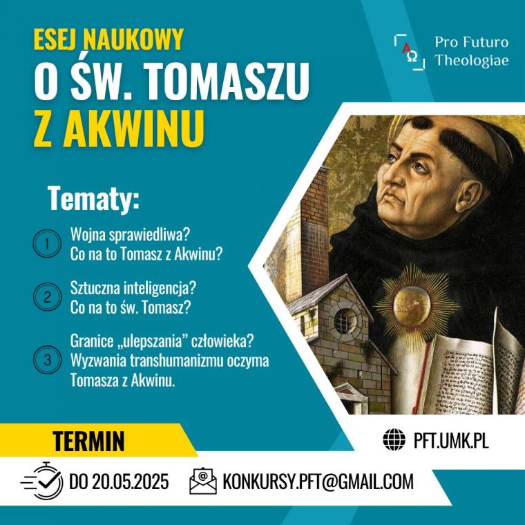 Fundacja Pro Futuro Theologiae działająca przy Wydziale Teologicznym Uniwersytetu Mikołaja Kopernika w Toruniu ogłasza konkurs na najlepszy esej o św. Tomaszu z Akwinu.