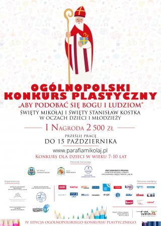 Rozpoczęto IV edycje ogólnopolskiego konkursu plastyczno-literackiego organizowanego przez parafię pw. św. Mikołaja w Lublinie. Konkurs wpisuje się w tradycyjne już lubelskie wydarzenie – Orszak św. Mikołaja. Jest on adresowany do uczniów klas siódmych i ósmych szkół podstawowych, oddziałów gimnazjalnych oraz uczniów klas I-III. Na zwycięzców czekają atrakcyjne nagrody finansowe w wysokości 2500 zł, 1500 zł i 1000 zł, warto, więc spróbować swoich sił w obszarze plastycznym lub literackim. Prace konkursowe będą przyjmowane do 15 października 2018 r.