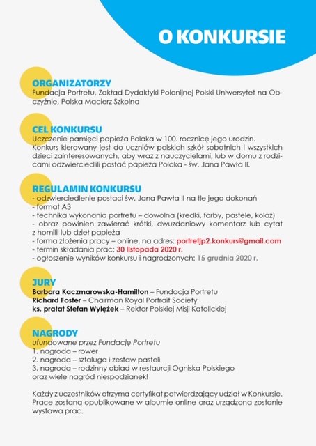 Wykonaj, przy użyciu dowolnej techniki, portret polskiego papieża!Wykonaną przez siebie pracę prześlij na adres e-mail: portretjp2.konkurs@gmail.com do dnia 30 listopada 2020.