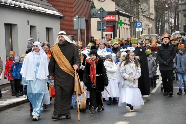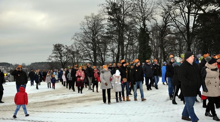 Z Rynku uczestnicy orszaku ulicami miasteczka udali się w kierunki Diecezjalnego Sanktuarium Świętego Rocha. Zatrzymał się na schodach prowadzących do sanktuarium, gdzie ks. kan. Krzysztof odczytał fragment Ewangelii św. Mateusza. Tu zaprezentowana została scenka przedstawiająca pokłon Mędrców ze Wschodu Bożej Dziecinie i złożenie darów. W dalszą drogę Królewski Orszak wyruszył już z Dzieciątkiem Jezus w kierunku parkingu przy sanktuarium. Podczas całej orszakowej drogi śpiewano kolędy. Na parkingu uczestnicy Orszaku obejrzeli jasełka przygotowane przez uczniów szkoły podstawowej z Kaliszkowic Ołobockich.