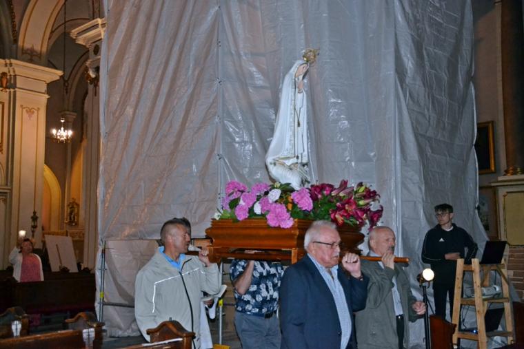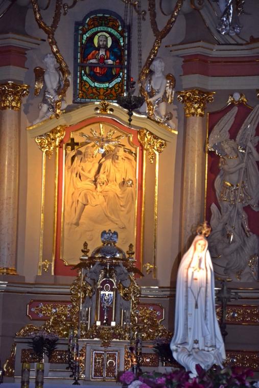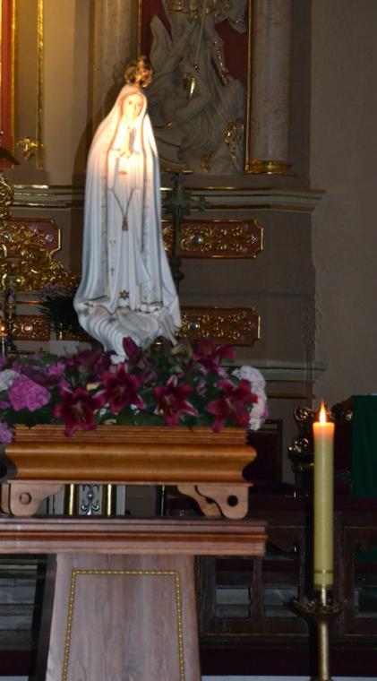 13. lipca o godz. 20:00 mikstaccy parafianie zgromadzili się na trzecim już w tym roku nabożeństwie fatimskim. Gdy przed rokiem relacjonowaliśmy to nabożeństwo ołtarz główny przesłonięty był foliową zasłoną. Trwały prace renowacyjne przy płaskorzeźbie Trójcy Świętej. Dziś możemy już podziwiać jej piękno. Lipcowe nabożeństwo fatimskie AD 2019 ponownie odprawione zostało w scenerii rusztowań i foliowych zasłon, kontynuowane są prace renowacyjne. Jednak i w tej „renowacyjnej scenerii” pięknie prezentowała się figura Matki Bożej Fatimskiej ustawiona w nawie środkowej, przyozdobiona kwiatami i otoczona miłującymi ją sercami parafian. Lipcowemu nabożeństwu fatimskiemu przewodniczył ks. proboszcz Krzysztof Ordziniak. Przed rozpoczęciem modlitwy różańcowej wprowadził nas w atmosferę wydarzenia sprzed ponad wieku. . Zapoznał nas z orędziem Maryi przekazanym dzieciom, podkreślając jednocześnie, że zadziwiać mogą te same okoliczności objawienia, wygląd szat Matki Bożej. Zaakcentował, że w czasach współczesnych do człowieka dociera wiele różnorodnych bodźców. Ks. kanonik zwrócił uwagę, że objawienia Maryi wskazują na potęgę tkwiąc nie w wielości, ale w systematyczności. Kapłan zachęcał zebranych do refleksji nad tym jaką modlitwę możemy systematycznie praktykować. Zachęcał do łącznia systematycznej modlitwy z udziałem w Eucharystii podczas której, możemy przyjmować Ciało Chrystusa. Zaakcentował, że świętość można osiągnąć realizując na co dzień wolę Bożą względem nas.