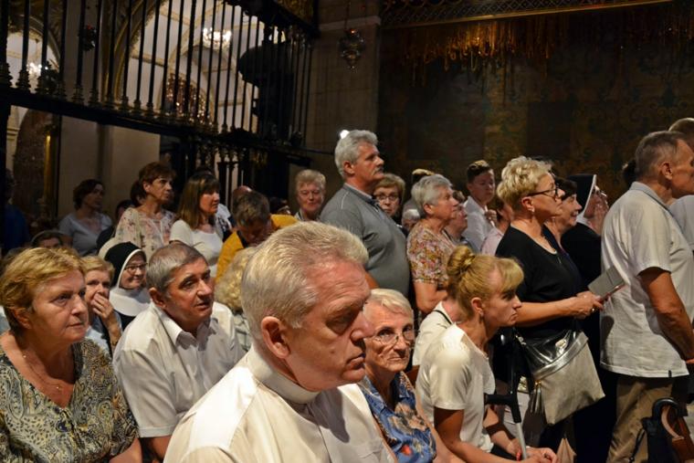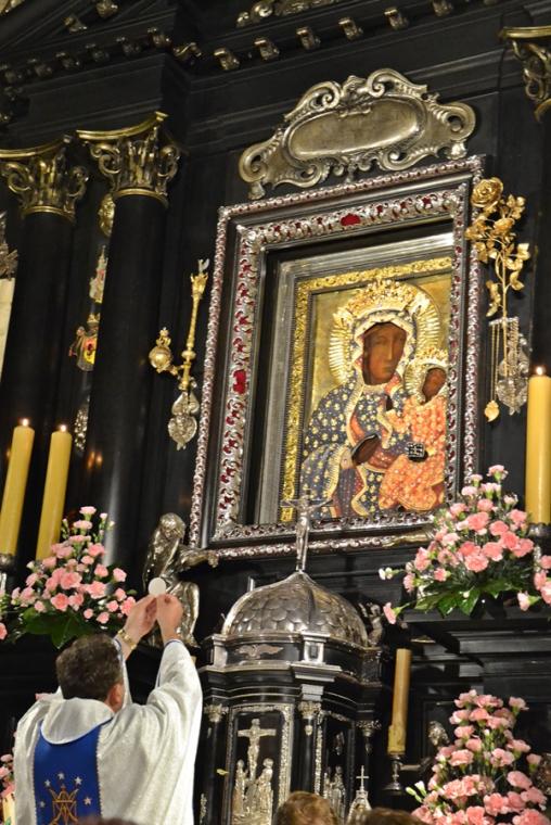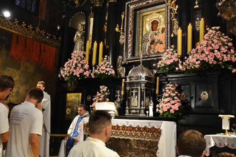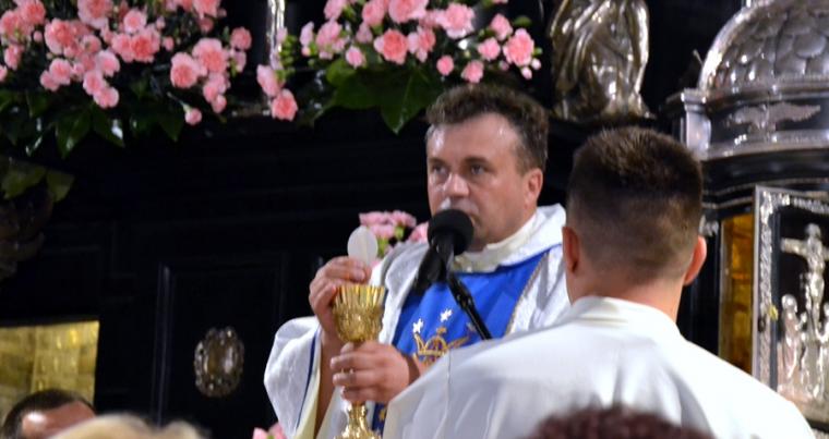 O godz.19:30 przeżywaliśmy w Kaplicy Cudownego Obrazu Eucharystię podczas której ks. kan. Krzysztof powierzał Pani Jasnogórskiej wszystkie nasze intencje. To właśnie ks. proboszcz przewodniczył tej mszy świętej, a jednym ze współcelebransów był kapłan posługujący w naszej kaliskiej diecezji ks. Jarosław Kołodziejczak. Wraz z nami modlili się m.in. uczestnicy I Biegowej Pielgrzymki Ministrantów Diecezji Kaliskiej. Wielu  z nas pierwszy raz miało okazję przeżywać Eucharystię w takiej bliskości Cudownego Obrazu Jasnogórskiej Pani. Była więc okazja, by  z bliska dostrzec pełne miłości, ale i zatroskania oczy Matki. Homilię podczas tej mszy św. wygłosił ks. Jarosław.  Podkreślił, że przybywając na Jasną Górę pierwsze kroki kierujemy do Kaplicy Cudownego Obrazu Czarnej |Madonny, by spojrzeć w oczy Matki i by Ona spojrzała na nas. Towarzyszy  nam  w tych chwilach modlitwa. Kaznodzieja pytał zgromadzonych, czy pamiętają o czym najpierw powiedzieli Maryi. Kontynuując dodał, że zapewne o tym co dla każdego jest  najcenniejsze, najważniejsze. Podkreślił, że Matka jest tą, która wysłucha, przytuli, zrozumie. W dalszej części kaznodzieja zwrócił uwagę, że wracając do codzienności  nie przychodzimy do Kaplicy nie po to, by się z Maryją pożegnać, ale by zabrać Ją ze sobą, zaprosić Ją do naszego życia, tak jak uczynili to młodzi  na weselu w Kanie Galilejskiej. Kontynuując kaznodzieja podkreślił, że Maryja jest tą dla nas tą, która podobnie jak podczas wesela w Kanie Galilejskiej dostrzega czego nam  w życiu brakuje i prosi swego Syna, by zaradził brakom. Nawiązując do słów Ewangelii podkreślił słowa Maryi: „Zróbcie wszystko cokolwiek wam powie mój Syn”. Słudzy wypełnili do końca wolę Boga. Kaznodzieja zaakcentował, że to właśnie wtedy  dokonał się cud. Akcentując, że Jezusa przemienił zwykłą wodę w wino. Zaznaczył, że woda jest czymś zwykłym, normalnym jak życie ludzkie. Ważne jest, by nasze życie zostało ubogacone łaską Bożą, by miało swój sens. W dalszej części rozważenia ks. Jarosław podkreślił, że przychodzimy do Maryi, by oddać jej  całe nasze życie, zarówno troski, cierpienia, ale i radości, aby wyprosiła dla nas u Syna swego potrzebne nam  łaski. Kaznodzieja apelował do pielgrzymów, by nie bali się powierzyć Maryi  najbardziej skrywanych tajemnic, gdyż jak podkreślił, jeśli uczynimy to z ufnością i posłuszeństwem Jezusowi Chrystusowi to w naszym życiu będą się działy cuda. W dalszej części zwrócił uwagę  na rolę słowa Bożego w  życia. Kończąc ks. Jarosław powiedział:  "Życzę wam, by to życie od tego momentu  było już nowym życiem, życiem słuchania, życiem modlitwy, życiem przemienionym, przez Jezusa Chrystusa, który jest naszym Panem. Dzisiaj obierzmy go jako Tego, który do nas mówi, a my jesteśmy jego wiernymi sługami. Amen”. Dziękujemy ks. Jarosławowi za ubogacenia nas swoim słowem, za zwrócenie uwagi na potrzebę zaufania i słuchania, pełnienia woli Bożej. Za słowa zachęty, byśmy trudne sprawy naszego życia dzieli z naszą najlepszą Matką. W tej wyjątkowej bliskości z Matką,  jakiej dane nam było przeżywać tę Eucharystię szczególnego znaczenia nabierały słowa pieśni: „To Matka ukoić może twe serce, przytulić tak mocno jak tuli Jezusa…”.