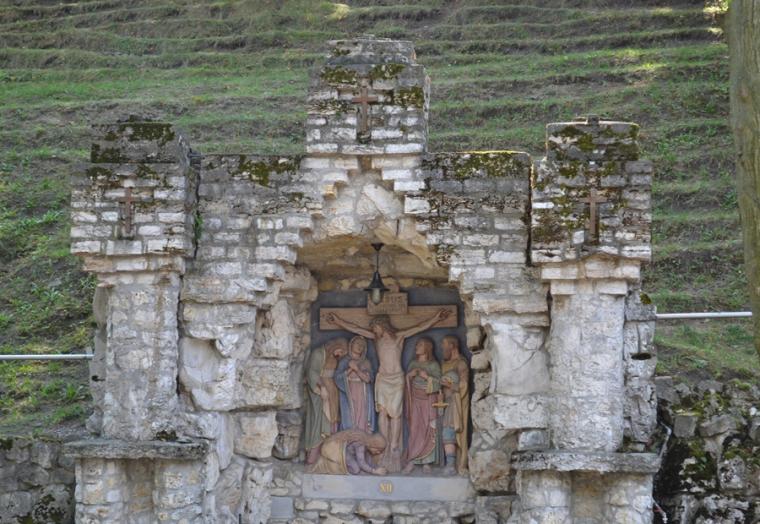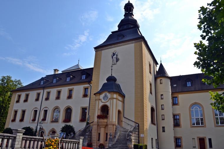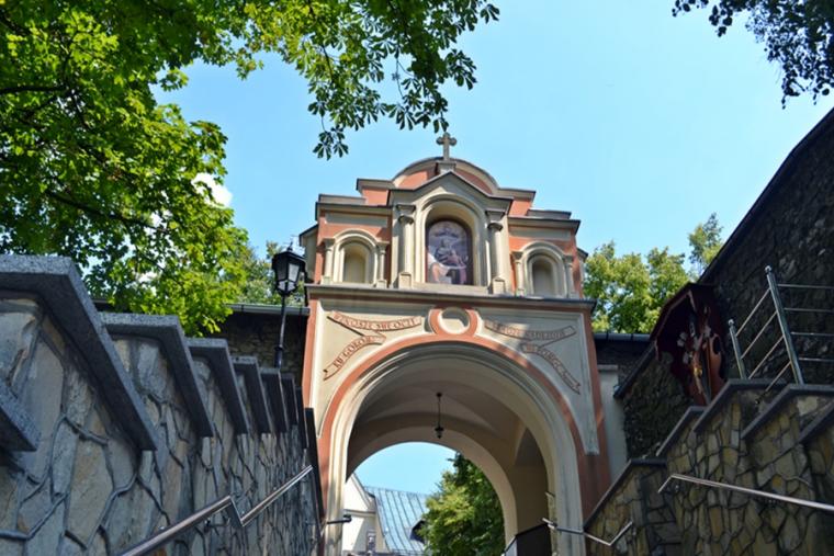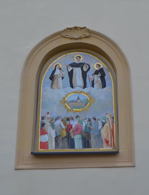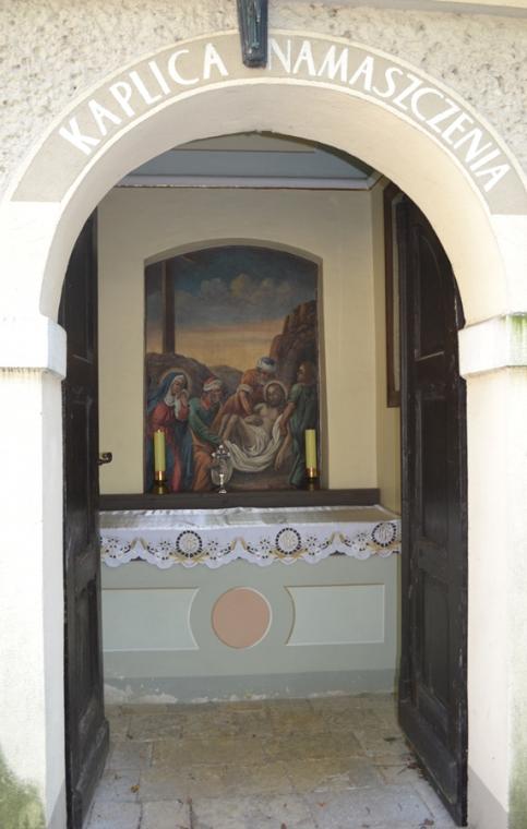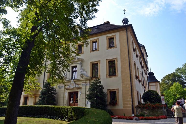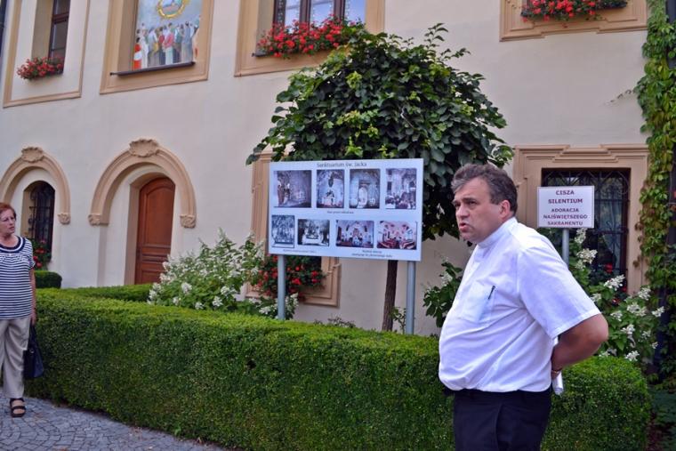 Kolejnym miejscem, które nawiedziliśmy był Kamień Śląski. Tu na świat przyszedł przyszły święty Jacek Odrowąż, bł. Czesław i bł. Bronisława. Kaplica poświęcona św. Jackowi powstała w XVIII wieku. Zachwyca swoim wystrojem. W centralnym punkcie ołtarza umieszczona jest statua św. Jacka. Po jej bokach znajdują się figury bł. Czesława i bł. Bronisławy. Na sklepieniu kaplicy podziwiać można przepiękne malowidła przedstawiające cztery sceny z życia Maryi: „Zwiastowanie", „Narodziny Jezusa w Betlejem", „Ofiarowanie Jezusa w świątyni", „Śmierć Maryi-Wniebowzięcie". W kaplicy codziennie od rana do zmierzchu odbywa się adoracja Najświętszego Sakramentu. Oczywiście nawiedziliśmy kaplicę sanktuarium św. Jacka, pokłoniliśmy się Jezusowi ukrytemu w Najświętszym Sakramencie. Wspólnie odmówiliśmy litanie do św. Jacka, a następnie był czas na indywidualna modlitwę oraz chwilę odpoczynku w parku pałacowym. Miejsce przepiękne, a niewielka kaplica stwarza atmosferę do refleksji i modlitewnej zadumy. Otaczający pałac park ze starymi drzewami i ptactwem pozwalał zachwycić się pięknem świata stworzonego przez Boga. Przemierzając alejki, w cieniu drzew w niewielkiej kapliczce można było spotkać Chrystusa frasobliwego. Dobrze nam było u św. Jacka w Kamieniu Śląskim, ale trzeba było wyruszyć dalej na pielgrzymi szlak.