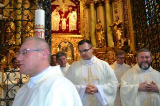 Po konferencji w Kaplicy Cudownego Obrazu zostało odprawione nabożeństwo do św. Józefa, które poprowadził ks. Michał Świgoniak. Ku niebu popłynęły słowa powitania św. Józefa, podziękowania za otrzymane łaski, ale także prośby, które w sobotnie przedpołudnie zostały złożone w sanktuarium. Po nich odmówiona została Litania do św. Józefa. Gdy zegar na wieży wybił godzinę dwunastą odśpiewany został Anioł Pański. Po modlitwie ks. prałat Jacek Plota, skierował słowa powitania do pielgrzymów. Najważniejszym punktem sobotniego spotkania ze Świętym Józefem była Eucharystia. Przewodniczył jej ks. prałat Jacek Plota, kustosz tego wyjątkowego miejsca, a współcelebransami kapłani przybyli z wiernymi ze swoich parafii. Homilię podczas Mszy św. wygłosił ks. Szymon Rybak. Rozpoczynając podkreślił, że nie jest przypadkiem, że znaleźliśmy się w Narodowym Sanktuarium Świętego Józefa właśnie w tym dniu. Zachęcał do tego, by poszukać samodzielnie odpowiedzi na pytania, po co się tutaj znaleźliśmy? Co św. Józef chce powiedzieć każdemu z nas? Nawiązując do słów Ewangelii (Łk8,4-15) podkreślił, że Pan Bóg jest tym, który sieje Słowo, niezależnie od tego, gdzie ono padnie, mając nadzieję, że wyda ono plon. Zaznaczył, że patrząc na życie św. Józefa widzimy, że jest ono żyzną glebą. Następnie ks. Szymon przywołał historię którą kiedyś usłyszał, a dotyczyła ona pytania, jakie konająca matka postawiła synowi kapłanowi: Czy ty naprawdę, żyjesz z Jezusem? Matka podkreśliła, że nie pyta syna kim jest, jakie ma znajomości, jaką ma władzę, ale czy naprawdę żyje z Jezusem. Kontynuując kaznodzieja podkreślił, że nie interesują go znajomości, pozycja społeczna, status materialny, decyzje, które mają do podjęcia zebrani w sanktuarium, ale interesuje go to czy naprawdę żyją z Jezusem. Jednocześnie podkreślił, że nie chodzi tutaj o deklaracje, ale o autentyczne życie wiarą. Ks. Szymon zachęcał, by szukać odpowiedzi na pytanie: kim jest dla nas Jezus, ale nie w deklaracji, tylko w konkretnych sytuacjach życiowych, podczas spotkań z różnymi ludźmi, w podejmowanych decyzjach. Podkreślał, że patrząc na św. Józefa widzimy, że nie składał Bogu wielkich deklaracji, ale cały czas żył słowem Bożym, mówił Bogu o swoich lękach.