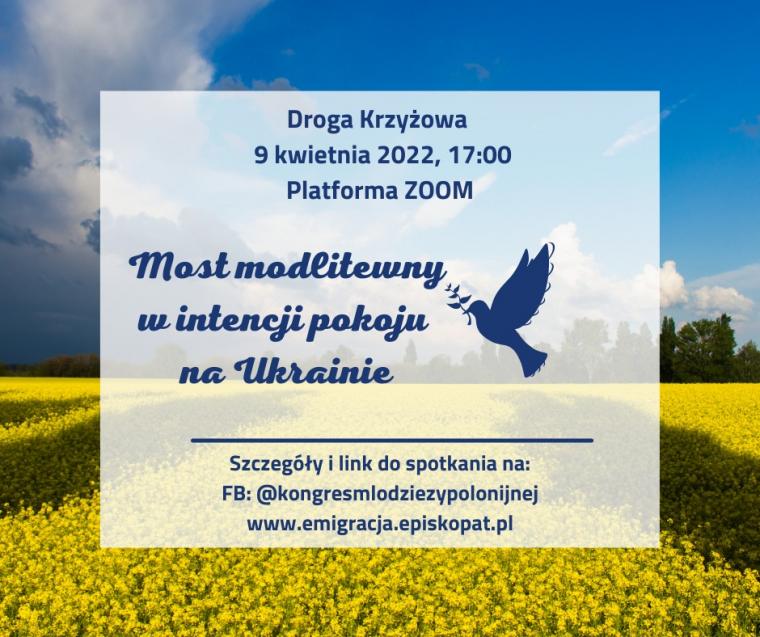 W sobotę 9 kwietnia o 17.00 - podczas spotkania "Kongresu Młodzieży Polonijnej online" zapraszamy do wspólnej modlitwy o pokój. Młodzież z Ukrainy poprowadzi Drogę Krzyżową- zapraszamy Was, a także Waszych przyjaciół i znajomych stwórzmy most modlitewny w intencji pokoju w Ukrainie. Jeśli nie możesz uczestniczyć w całym spotkaniu Kongresu Młodzieży Polonijnej - Bądź z nami na modlitwie!