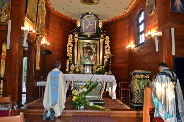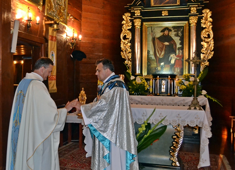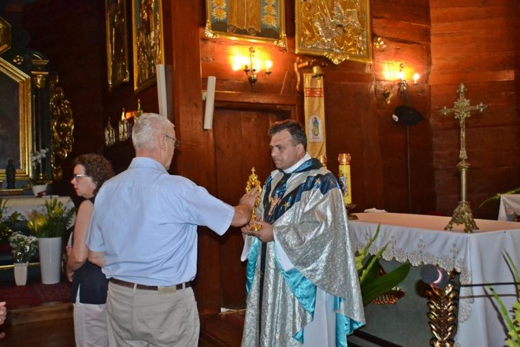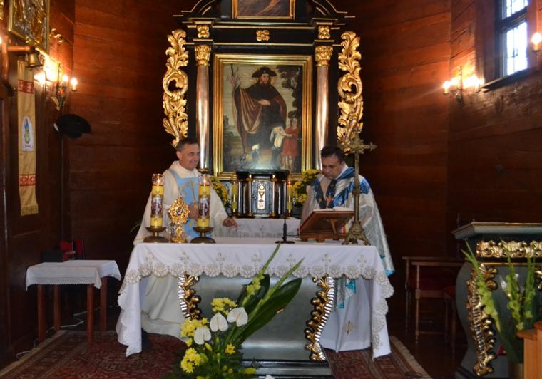 O godz. 18:30 sprawowana była w sanktuarium Eucharystia, której przewodniczył ks. kan. Adam Kosmała, proboszcz parafii rzymskokatolickiej pw. Narodzenia Najświętszej Maryi Panny w Kotłowie. Współcelebransem był ks. kan. Krzysztof Ordziniak. Mszę św. tradycyjnie już w tym przedodpustowym czasie poprzedził śpiew Godzinek o św. Rochu Wyznawcy. Ksiądz kan. Adam wygłosił do zebranych homilię. Przedmiotem rozważania było błogosławieństwo zawarte w słowach „ Błogosławieni, którzy się smucą, albowiem oni będą pocieszeni…”