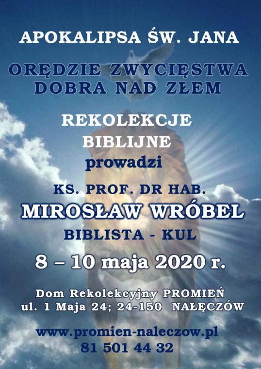 W majowy weekend 8-10 MAJA 2020 R. REKOLEKCJE: Apokalipsa św. Jana - orędzie zwycięstwa dobra nad złem. Rekolekcje noszące tytuł: Apokalipsa św. Jana - orędzie zwycięstwa dobra nad złem będzie prowadził Ks. prof. dr hab. Mirosław Wróbel. Rekolekcje te będą okazją do odczytania losów naszego pokolenia i spojrzenia w przyszłość w świetle Słowa Bożego. W każdym z nas jest oczekiwanie na spełnienie obietnic Boga i tęsknota za pokojem, zwycięstwem dobra nad złem. Czy Apokalipsa zapowiada taki czas? Odpowiedz na to pytanie otrzyma każdy, kto w ciszy Domu Rekolekcyjnego PROMIEŃ, prowadzonego przez Zgromadzenie Sióstr Służek NMP Niepokalanej w Nałęczowie, zatrzyma się i zechce wziąć udział w tych rekolekcjach.