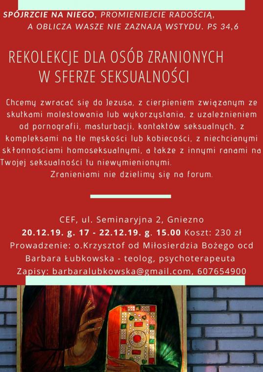 Karmelita o. Krzysztof Piskorz i terapeutka Barbara Łubkowska zapraszają do uczestnictwa w rekolekcjach osoby, które doświadczyły różnych zranień w dziedzinie seksualności.Najbliższe odbędą się w dniach 20-22 grudnia br. w Gnieźnie w Centrum Edukacyjno-Formacyjnym Archidiecezji Gnieźnieńskiej.