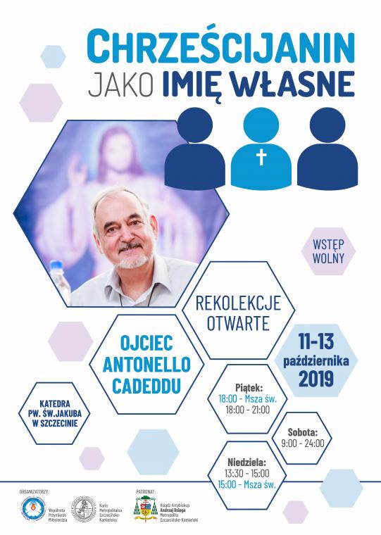 Ojciec Antonello Cadeddu - współzałożyciel ewangelizacyjnej wspólnoty "Przymierze Miłosierdzia" - wygłosi w szczecińskiej katedrze otwarte dla wszystkich rekolekcje. Hasło rekolekcji zostało zaproponowane przez wspierającego to wydarzenie Metropolitę Szczecińsko - Kamieńskiego Andrzeja Dzięgę, a brzmi ono: "Chrześcijanin jako imię własne". Udział w spotkaniach jest nieodpłatny. Odbędą się one według następującego porządku: - piątek (11.10) w godzinach 18:00 - 21:00; sobota (12.10.) w godzinach 9:00 - 24:00; niedziela (13.10.) w godzinach 13:30 - 17:30. W sobotę jest przeznaczony czas około 2 godziny na przerwę obiadową, w czasie której uczestnicy rekolekcji mogą skorzystać z oferty szczecińskich punktów gastronomicznych. Jest ich w centrum Szczecina bardzo wiele.