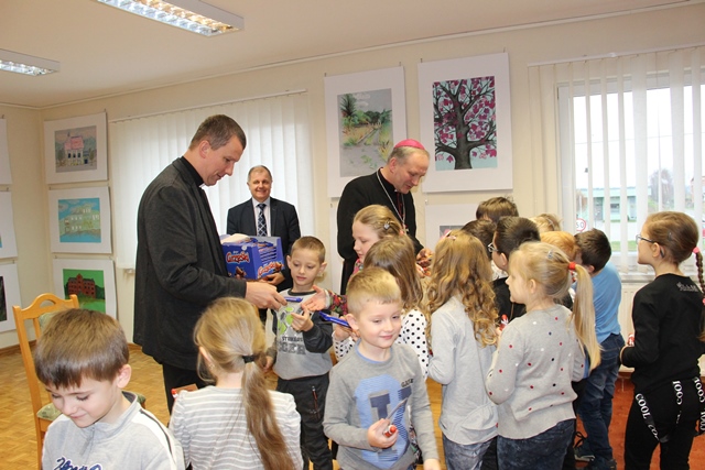 Dyrektor Maria Marciniak zaprosiła do biblioteki biskupa pomocniczego diecezji kaliskiej Łukasza Buzuna na rozpoczęcie cyklu „Świąteczne czytanie dzieciom”. Gość przeczytał książkę pt. „Boże Narodzenie” Bogusława Noska i Oli Makowskiej. Opowieści wysłuchali uczniowie klasy pierwszej ze Szkoły Podstawowej w Sieroszewicach. Dzieciom towarzyszyła wychowawczyni Danuta Chwiłkowska. W spotkaniu uczestniczył ks. Rafał Kopis, kapelan biskupa.