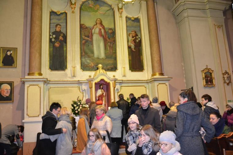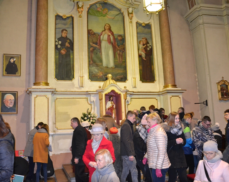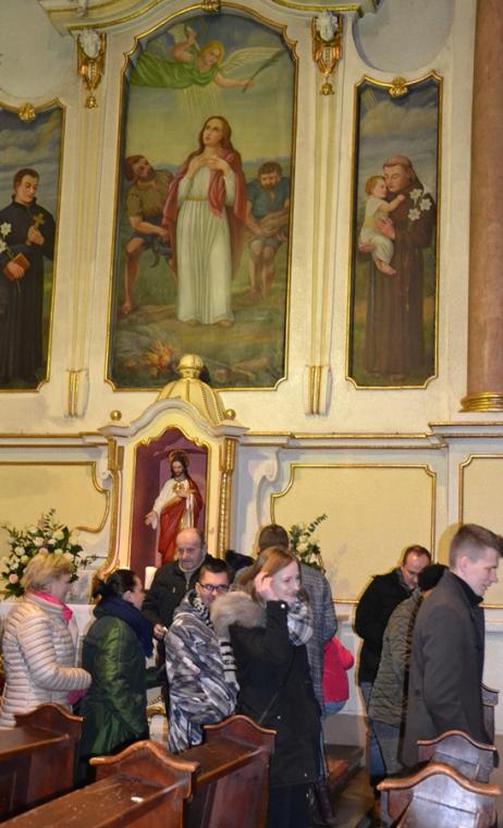 Kończąc zwrócił się ze szczególną prośbą do św. Agaty. Kilka dni temu trzech młodych mężczyzn z naszej parafii zginęło w wypadku samochodowym. Prośba była związana z tym tragicznym wydarzeniem. Ks. prałat Kazimierz prosił, by św. Agata wyprosiła młodym ludziom u Boga miłosierdzie, radość wieczną, a dla wszystkich opłakujących  ich śmierć była umocnieniem w tym doświadczeniu, by pomogła przyjąć im wolę Bożą, chociaż jest ona tak trudna. Wiele ważnych słów padło podczas tej homilii. Warto do nich wrócić, bo refleksja nad nimi pozwoli na zmianę życia. A przecież był to odpustowy czas, czas szczególnych łask, ale i przemiany życia. Wraz z nami modliła się wspólnota TACY SAMI,   uczestnicy wczasorekolekcji w Wojkowie, którzy po Eucharystii przezywali swoje spotkanie świąteczno- karnawałowe.