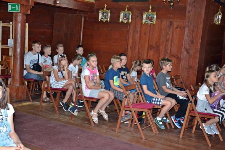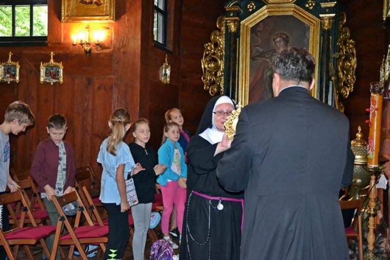 Jak okazało się w drugim dniu spotkań, dzieci sumiennie wykonały pracę domową. Było jeszcze jedno zadanie, gdyż w trakcie tegorocznej Szkoły pojawił się kufer dziedzictwa. Podczas poszczególnych dni dzieci będą wkładały do niego rysunki, fotografie, opisy, tego co składa się na nasze dziedzictwo kulturowe. Na początek dzieci miały przyjrzeć się dziedzictwu należącemu do nich. Kufer w czwartkowe przedpołudnie zaczął się wypełniać. W tym drugim dniu w Rochowej Szkole był oczywiście czas na modlitwę nowennową podczas której ks. kan. Krzysztof odczytywał przyniesione przez młodych intencje. Potem dzieci uczciły relikwie św. Rocha. Po modlitwie przyszedł czas na wspólny śpiew. W jego prowadzeniu niezastąpiona okazała się s. Małgorzata, która pewnie już do końca spotkań w Rochowej Szkole będzie dbała o to, by rozśpiewać dzieci, a także organizować dla nich zabawy ruchowe.Ta wakacyjna szkoła została zorganizowana m.in. po to, by dzieci poznały życie św. Rocha, a także wartości, którymi kierował się On w swoim życiu. W tym celu ksiądz kustosz wykorzystał fragment programu „Ziarno” poświęconego św. Rochowi. Dodajmy, że fragmenty tego programu były realizowane na terenie naszej parafii. Uczestniczyli w nim młodzi Mikstaczanie. W drugim dniu omówione zostały atrybuty, z którymi na obrazach i rzeźbach przedstawiany jest św. Roch. Stało się to impulsem do wskazania podobieństw i różnic w ikonograficznych przedstawieniach św. Rocha i św. Jakuba. Podczas spotkania dzieci obejrzały film animowany „N- jak niewidomy”, w którym mogły zobaczyć w jaki sposób można pomagać osobom niewidomym bądź niedowidzącym. Ksiądz kustosz omawiając strój św. Rocha zwrócił uwagę na laskę pielgrzymią. Z filmu dzieci dowiedziały się, że biała laska może być bardzo pomocna dla osoby niewidomej. Nie zabrakło także opowieści o psach przewodnikach osób niewidomych. Film był forma przygotowania do spotkania z gościem, który tego dnia odwiedził uczestników Szkoły Świętego Rocha. Mamy nadzieję, że spotkanie to na długo pozostanie w ich pamięci. Kim był ten niezwykły gość? Otóż na spotkanie z młodymi przybyła Pani Gabriela Przygoda. Pani Gabriela jest osobą niewidomą, straciła wzrok mając 20 lat. Podczas spotkania Pani Gabrysia przedstawiła się w kilku zdaniach, a następnie bardzo chętnie odpowiadała na pytania młodych, trzeba przyznać, że było ich bardzo wiele. Młodzi pytali m.in. o to jak radzi ona sobie z czynnościami dnia codziennego takimi jak sprzątanie, gotowanie, prasowanie, mycie, poruszanie się po mieszkaniu, dobieranie kolorystyki ubrania, pakowanie walizki na wyjazd. Pani Gabrysia podkreślała, że pomocne są tu często zdobycze techniki. Podkreśliła, że osoby niewidome mają z reguły bardzo uporządkowane życie. Troska o ład ułatwia im funkcjonowanie, gdyż wiedzą wtedy gdzie mogą znaleźć konkretne przedmioty. Jest jeszcze jedna rzecz, którą należy powiedzieć o gości. Pani Gabriela została obdarowana przez Pana Boga pięknym głosem. Dane nam było posłuchać w sanktuarium pieśni Ave Maria Jasnogórska Pani. Może kiedyś uda się Pani Gabrysi wydać płytę, życzymy jej tego z całego serca. Po licznych pytaniach zadanych przez młodych ksiądz kan. Krzysztof zapytał Panią Gabrysię co chciałaby powiedzieć młodym ludziom. Zacytujmy to przesłanie: „Żeby żyli każdym dniem, żyli tak, żeby nikt przez nich nie płakał, bo jeżeli jest się młodym nie zwraca się uwagi na to co się robi, krzywdzi się ludzi, to to wszystko potem wraca, jeżeli się ich nie krzywdzi, a stanie się nam krzywda to ma się pomoc z każdej strony, ale jeśli się tego nie zauważa i tego nie robi to wtedy jest naprawdę ciężko”.
