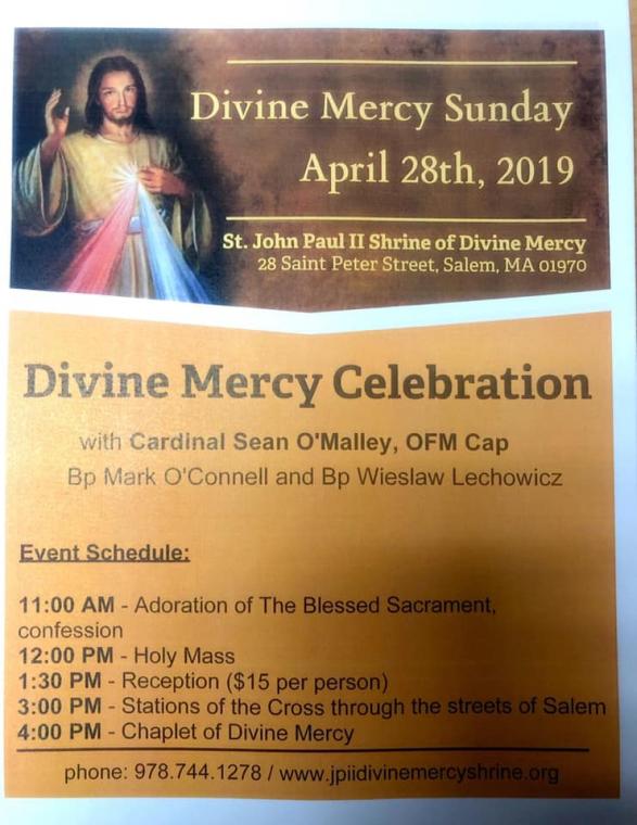 28 kwietnia w  Niedzielę Bożego Miłosierdzia w Salem Polacy wraz z Amerykanami czcili Boże Miłosierdzie Eucharystią pod przewodnictwem kard. O’Malley, drogą krzyżową ulicami miasta i odmówieniem koronki do Bożego Miłosierdzia. W uroczystościach wziął Delegat KEP ds. Duszpasterstwa Emigracji Polskiej,  bp Wiesław Lechowicz
