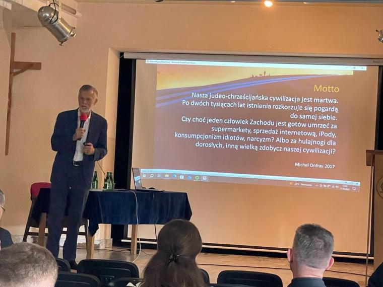 Kolejny referat wygłosił Profesor Andrzej Zybertowicz. Wystąpienie dotyczyło Wpływu migracji na przyszłość polskiego społecznego. Prelegent zaznaczył, że każdy z nas podejmując dialog i współpracę potrzebuje wyraźnych granic. Chroni to nas, nasze rodziny oraz naszą tożsamość narodową. Pragnąc skonfrontować problem migracji potrzeba szeroko rozumianej współpracy kulturowej, gospodarczej, społecznej a nawet politycznym. Każde Państwo ma troszczyć się o swoją suwerenność i podmiotowość. Zdaniem prelegenta największymi wyzwaniami stojącymi przed współczesnym społeczeństwem są: sprawna zdolność w zarządzaniu konfliktami międzykulturowymi oraz właściwy balans pomiędzy chęcią rozwoju technologicznego a nurtem migracyjnym.