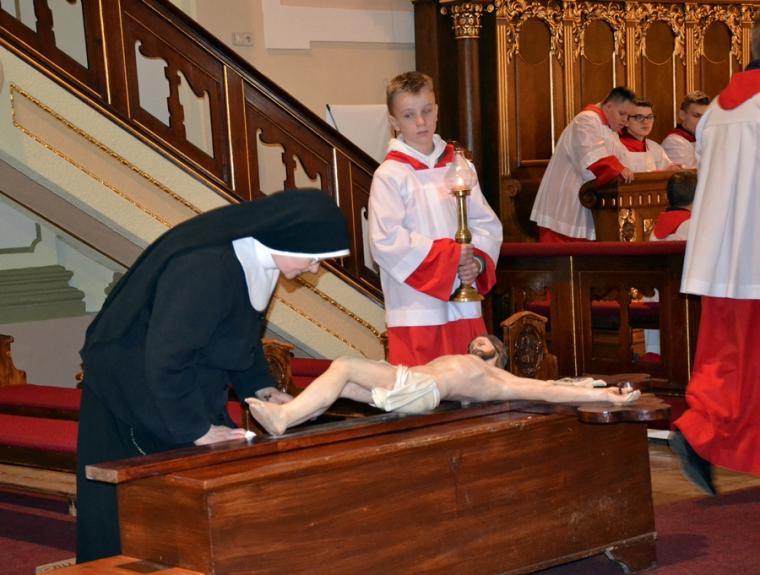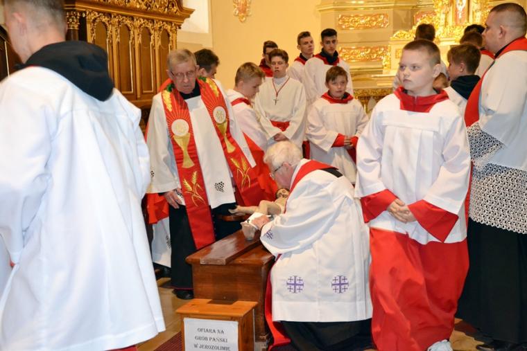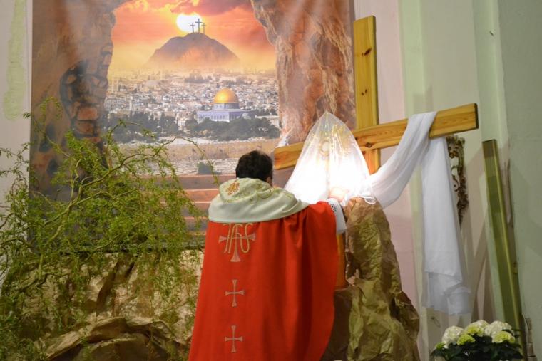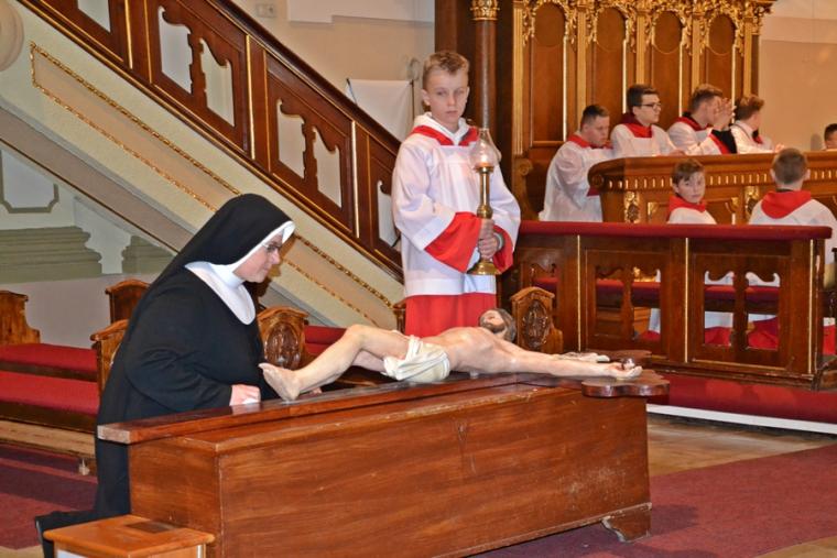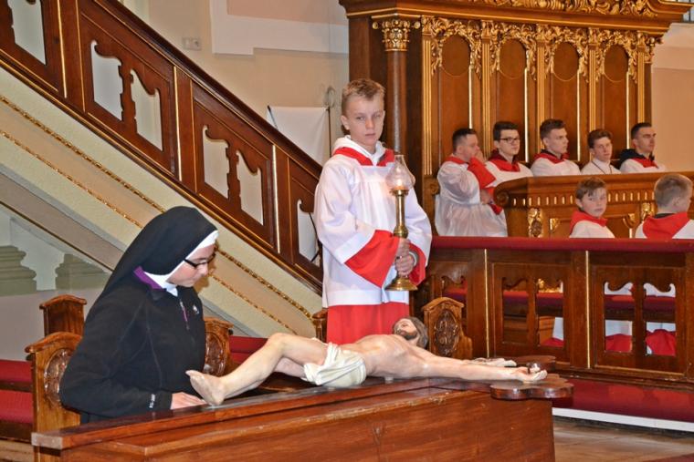 Usłyszane podczas tej liturgii słowa zapewne zachęciły nas do refleksji nad miejscem krzyża w życiu i dodały sił do zmagania się z naszymi krzyżami. Zapewne każdy z obecnych w kościele chce być godnym Chrystusa. Po modlitwie powszechnej nastąpiło uroczyste wprowadzenie i odsłonięcie krzyża oraz jego adoracja. Najpierw uczcili krzyż kapłani, siostry zakonne, ministranci. Po zakończonej liturgii przez całą noc i kolejny dzień taką okazję będą mieli wszyscy wierni. Dodajmy, że krzyż ten niedawno powrócił do kościoła po przeprowadzonych pracach renowacyjnych. Prezentuje się teraz pięknie.