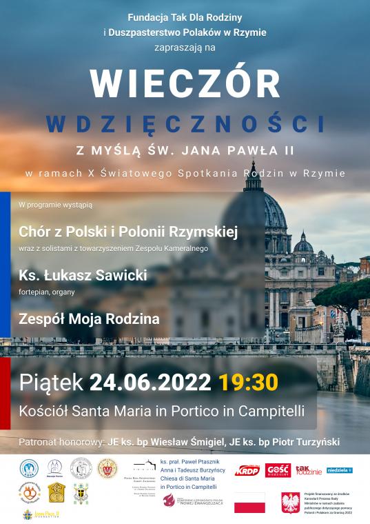 W dniach 22-26 czerwca 2022 roku odbywa się w Rzymie X Światowe Spotkanie Rodzin. W Spotkaniu bierze udział delegacja - Rodzin Polonijnych wraz z bp. Piotrem Turzyńskim, Delegatem KEP ds. Duszpasterstwa Emigracji Polskiej. W ramach Spotkań w Parafiach Rzymskich w piątek godz. 19.30 w Kościele Santa Maria in Portico in Campitelli odbędzie się „Wieczór Dziękczynienia”. Będzie to Koncert podczas którego wystąpią muzykujące rodziny z Polski i Rzymu, chór, zespół kameralny i soliści. Ponadto będzie można usłyszeć świadectwa i wspomnienie o Św. Janie Pawle II, który zainicjował Światowe Spotkania.
