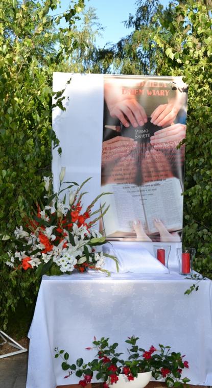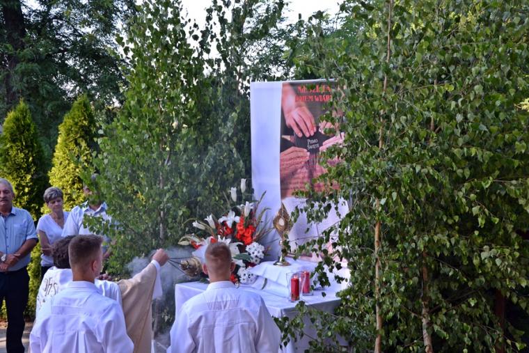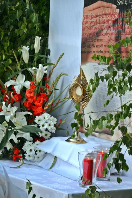 Po Mszy Świętej odbyło się wystawienie Najświętszego Sakramentu, odmówiliśmy Litanię do Serca Jezusowego. Następnie z Jezusem ukrytym pod postacią Chleba wyruszyliśmy alejkami cmentarnymi w procesji do czterech ołtarzu. Myślą przewodnią haseł, która znalazły się w tym roku na przygotowanych przez poszczególne rejony parafii była NIEDZIELA. Hasła skłaniały wiernych do spojrzenia na niedzielę w następujących aspektach: Niedziela dniem Kościoła, Niedziela dniem rodziny, Niedziela dniem wiary, Niedziela dniem człowieka. Procesję zakończyło błogosławieństwo Najświętszym Sakramentem na cztery strony świata. Następnie odbyło się poświęcenie wianków z ziół i kwiatów. To wyraz naszej wiary i zaufania Bogu. Przyniesione zostały pierwociny pól i łąk, by Bóg nam błogosławił, by nikomu nie zabrakło chleba powszedniego, bo tego będącego pokarmem dającym życie wieczne nigdy nie zabraknie… Obyśmy tylko chcieli się nim karmić… Zadziwiająca jest siła wiary i tradycji w naszej wspólnocie.