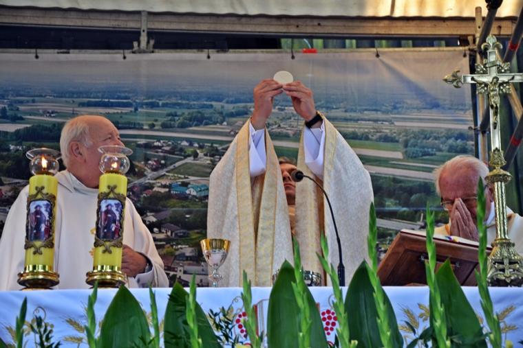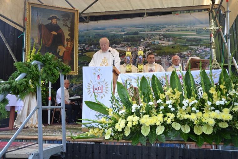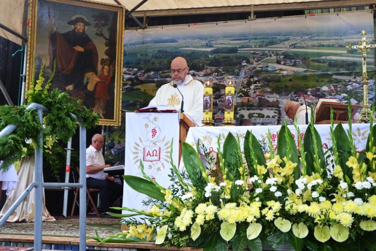 Homilię wygłosił o. Jerzy Brusiło, krajowy duszpasterz lekarzy i służb weterynaryjnych. Zaznaczył, że chociaż  św. Roch ma wiele przymiotów związanych ze zwierzętami, podróżującymi, to w obecnych czasach w kulcie dominuje jako patron od chorób zaraźliwych. Pytał, dlaczego zwracamy się właśnie do niego i wyjaśnił, że Roch żył w czasach epidemii dżumy, pochylał się nad zarażonymi, sam się zaraził, doświadczył epidemii i został cudownie uzdrowiony. Jest więc tym, który, wie, czym jest niebezpieczeństwo choroby. Kaznodzieja zaakcentował, że Roch jest tym, który przeszedł przez to, czego my doświadczamy, dlatego nas rozumie. Zauważył, że nie tylko w czasie odpustu przychodzimy do św. Rocha, ale i w innych trudnych chwilach. Następnie O. Jerzy podzielił się swoim świadectwem z czasu zakażenia. Zaznaczył, że w czasie choroby zwracał się  codziennie do św. Rocha. Modlitwa była dla niego źródłem pokoju i umocnienia. Zachęcał, byśmy modlili się do św. Rocha nie tylko w czasie choroby, bo jest on tym, który pomaga przejść przez różne trudne doświadczenia. Czując wsparcie św. Rocha, powinniśmy zapytać, co dla niego było źródłem siły do pokonania choroby, pomocy zarażonym, umierającym. Podkreślił, że z pewnością były to takie jego cechy jak hart ducha, miłość bliźniego, wiara. Najważniejszym jednak źródłem siły Rocha była Eucharystia. Na pielgrzymim szlaku zatrzymywał się w miejscach kultu, uczestniczył w Eucharystii, przyjmował Komunię  św. Eucharystia była dla niego czymś niezwykle ważnym – podkreślił kaznodzieja. W dalszej części o. Jerzy zwrócił uwagę na to, że podczas obecnej epidemii była pewna trudność udziału w Eucharystii. Zaznaczył jednak, że należy dołożyć wszelkich starań, by w Eucharystii uczestniczyć. Zwrócił uwagę, że pod koniec 2019 roku rozpoczął się cykl duszpasterski pod hasłem „Eucharystia daje życie”, które realizowane jest przez duszpasterzy. Prawie natychmiast nastąpiły ograniczenia. Ojciec Jerzy podkreślił, że mimo wszystko należy korzystać z sakramentów, chodzić  do kościoła, trzymać się Eucharystii. Zaznaczył, że przykład św. Rocha pokazuje, że to pomaga, dodaje sił, jest lekarstwem na chorobę, ale i na lęki, niepokoje związane z epidemią. Ponadto nasz patron wskazuje nam, byśmy we Mszy św., Komunii św., adoracji, procesjach szukali siły do pokonywania trudności. Kończąc o. Jerzy powiedział: „ Błogosławieni, którzy się smucą, albowiem oni będą pocieszeni. Będą pocieszeni i umocnieni przez Komunię św., przez Eucharystię. To wskazanie św. Rocha niech nam towarzyszy, bo Eucharystia daje życie”.